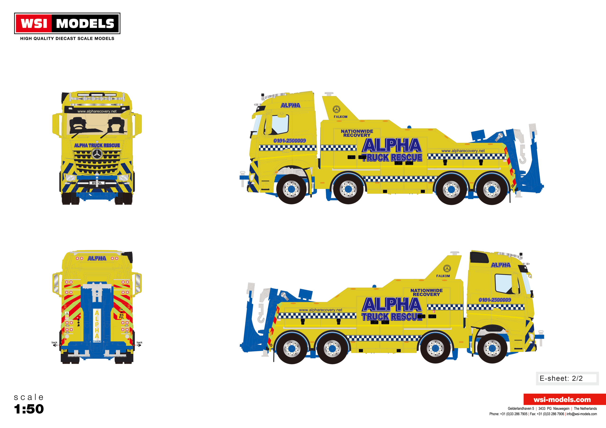 1:50 scale Mercedes 8×4 Falkom recovery truck customised in the livery of Alpha Recovery.